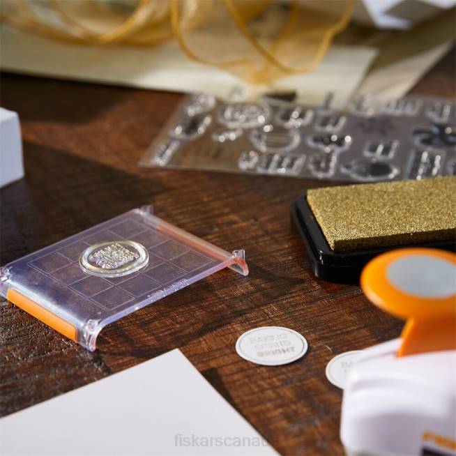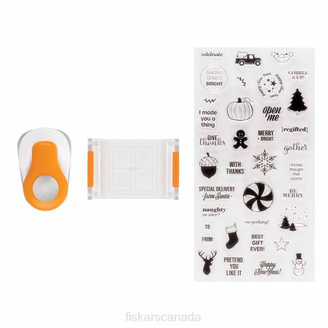 - Fiskars Fall & Winter Party Decorations Set includes three tools: a 1″ circle lever punch, a stamp block and a sheet of clear stamps