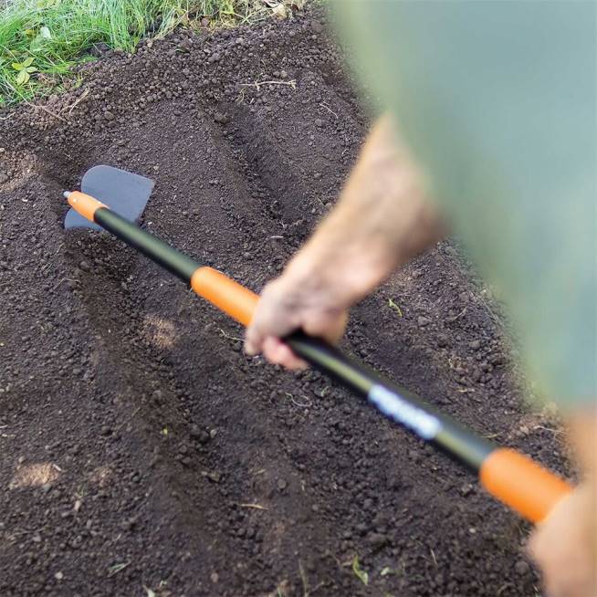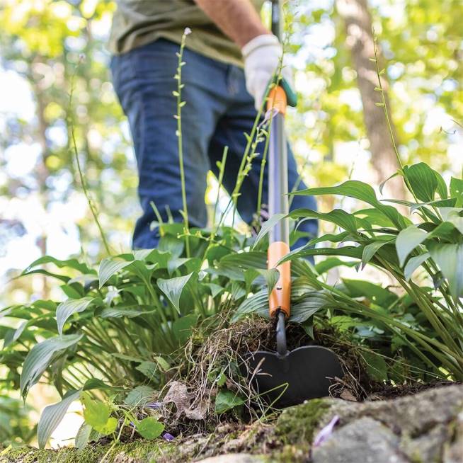 Durable, yet lightweight, the Fiskars Hoe features a riveted head that won’t detach, making it ideal for ripping out shallow-rooted weeds from tough soil. A sharpened, steel edge makes it easier to dig and break up thick, dirt clods. A strong, lightweight, fiberglass handle features a mid-grip that provides multiple grip positions for added comfort and control. The powder-coated steel also helps prevent rust.