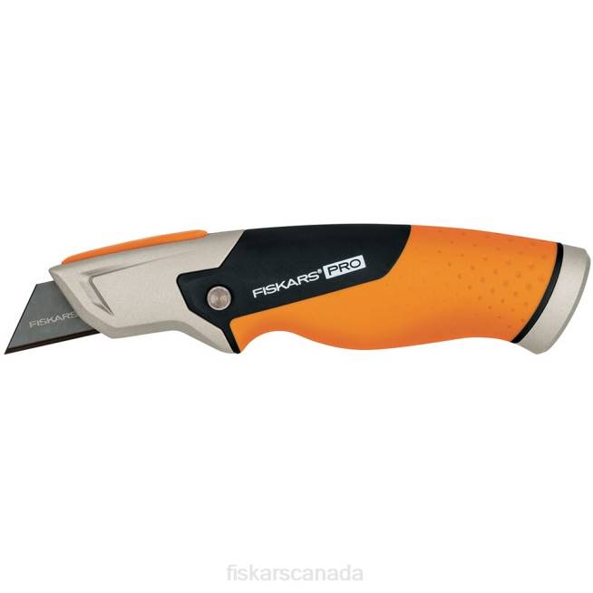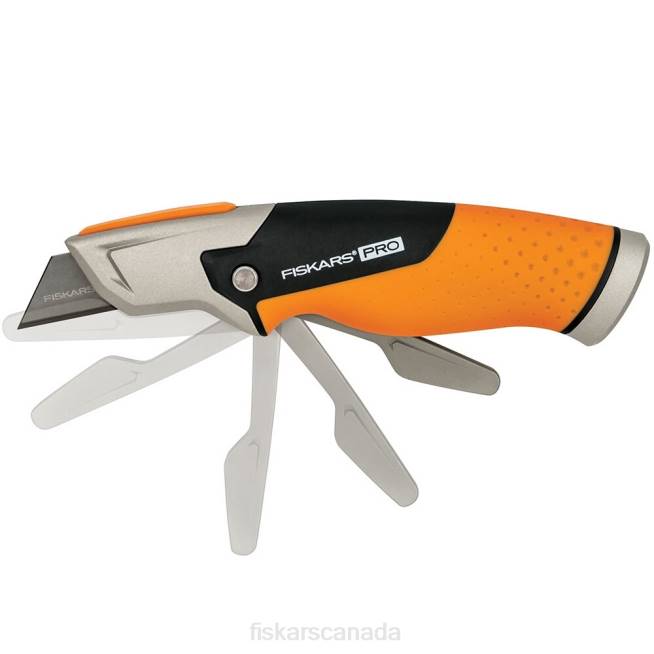 - The Fiskars Pro Fixed Utility Knife’s folding blade guard deploys with the push of a button for convenient, easy protection
