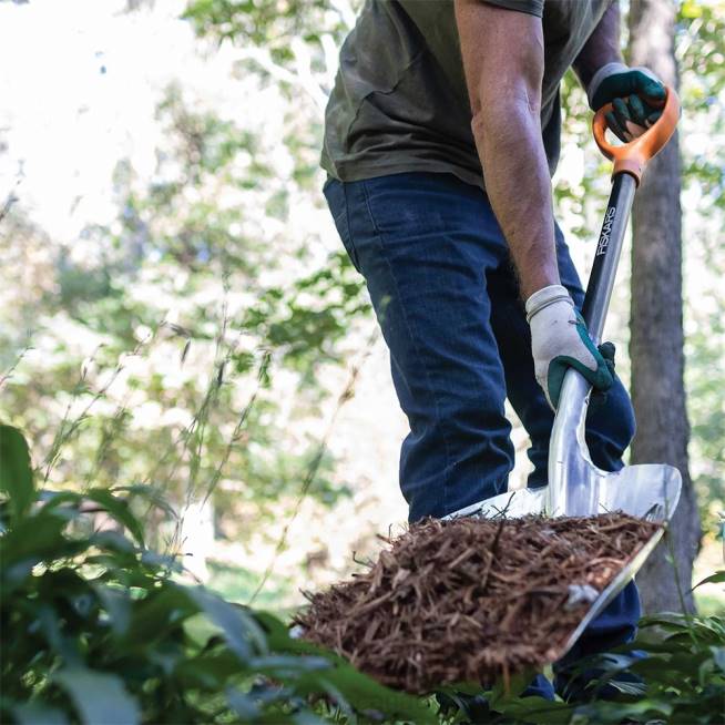 - The Fiskars Scoop Shovel features a big, secure, aluminum head, making it ideal for moving large volumes of mulch, grain, seeds, soil and more