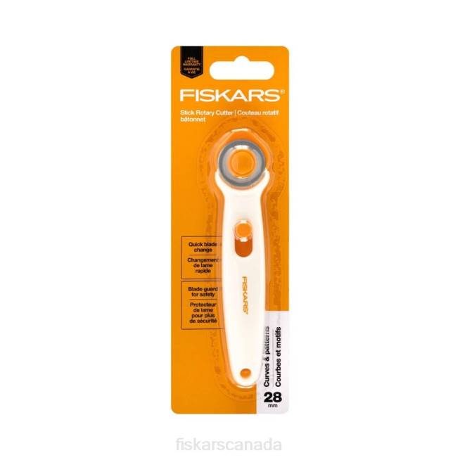 - Fiskars Stick Rotary Cutter (28 mm) is ideal for cutting intricate curves, patterns and applique in single layers of fabric