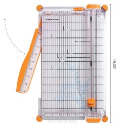 The Fiskars ProCision Rotary Bypass Trimmer features a unique, dual-rail system that stabilizes the rotary blade and eliminates wiggle, for straight, perfectly precise cuts through a wide range of thick materials. Perfect for DIY projects, additional innovations include a rotary bypass blade that stays sharp and never needs to be replaced, as well as a built-in smudge guard. The trimmer also features grid line measurements on both the top and bottom of the smudge guard, allowing you to move the 14″ extended base deck to your left or right. A convenient folding design allows it to take up less space during storage and transport, while an anti-wear veneer surface provides long-lasting performance.